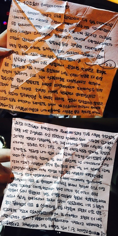 이와 함께 '아이돌 학교' 촬영 전 10주 후에 해인이에게 편지 사진을 공개했다.
