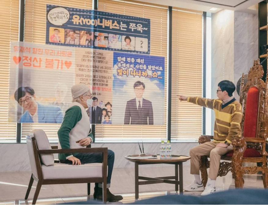 '놀면 뭐하니?'는 6일 공식 SNS를 통해 "유느님 대상 기념 주접 3종 세트"라며 "100개 달 거 꾹-참고 소소하게 준비해본 '현수막', 독보적 존재감에 어울리는 독보적 '王의자' 우리 마음의 크기 1/10 사이즈 '대형꽃다발'"을 공개했다.
