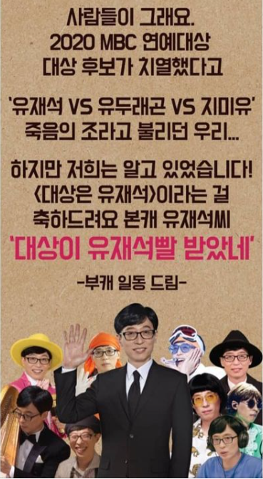 덕력이 가득한 포스터에는 "유재석 향한 우리 사랑은 정산불가" "집에 전등 대신 유재석씨 사진을 달았어요. 빛이 나니까" "사람들이 그래요. 2020 MBC 연예대상 대상 후보가 치열했다고. 유재석VS유두래곤VS지미유 죽음의 조라고 불리던 우리. 하지만 저희는 알고 있었습니다. '대상은 유재석' 이라는 걸. 축하드려요. 본캐 유재석씨. 대상이 유재석빨 받았네. -부캐일동 드림-" 등의 주접글이 가득했다.