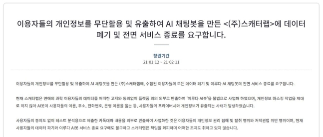 청원 게시글은 "(연애의 과학) 사용자와 카톡 대화를 한 지인들 개인정보까지 유출됐다"며 "사용자들의 데이터 파기 요구에도 스캐터랩은 책임을 회피하며 어떤 조치도 취하지 않고 있다"고 비판했다.
