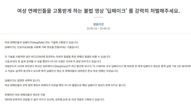 12일 청와대 국민청원 게시판에는 '여성 연예인들을 고통받게 하는 불법 영상 '딥페이크'를 강력히 처벌해주세요'라는 제목의 청원이 등록됐다.