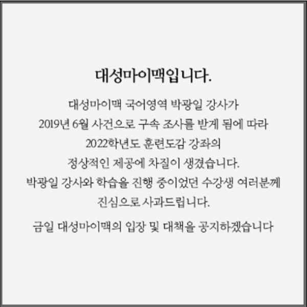 대성마이맥 측은 19일 "박광일 강사가 구속 조사를 받게 됨에 따라 2022학년도 훈련도감 강좌의 정상적인 제공에 차질이 생겼다"라면서 "진심으로 사과드린다. 오늘 중으로 입장 및 대책을 밝히겠다"고 공지했다.