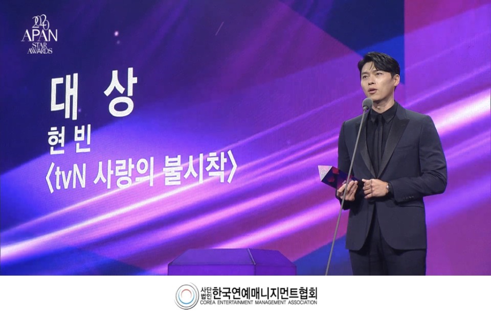 23일 열린 '2020 APAN STAR AWARDS' 대상 트로피는 현빈에게 주어졌다. 현빈은 지난해 손예진과 호흡한 tvN 드라마 '사랑의 불시착'으로 또 한편의 대표작을 쓴 바. 김희애, 공효진, 박서준, 김혜수 등 쟁쟁한 경쟁자들과 경합 끝, 대상의 영예를 안게 됐다.