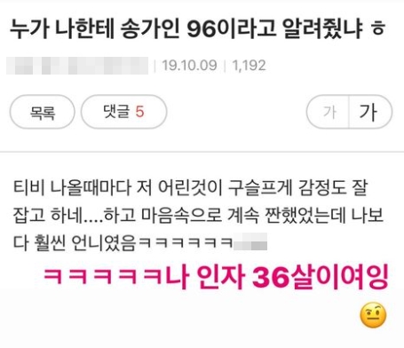 이 누리꾼은 "누가 나한테 송가인 96년생이라고 알려줬냐. TV 나올 때마다 저 어린 것이 구슬프게 감정도 잘 잡고 하네'하고 마음속으로 계속 짠했었는데 나보다 훨씬 언니였음"이라고 적었고, 송가인은 이 캡처본과 함께 "나 인자 36살이여잉"이라고 적어 웃음을 자아냈다. 동안 외모로 팬에게 착각을 준 송가인의 유쾌한 면모였다.