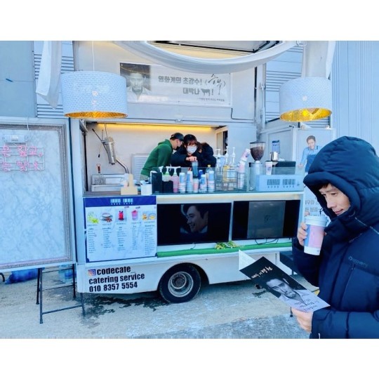 공개된 사진에는 롱패딩 차림에 모자를 뒤집어쓴 이병헌이 커피차 앞에서 손에 커피를 들고 흐뭇하게 미소짓고 있는 모습이 담겨있다.