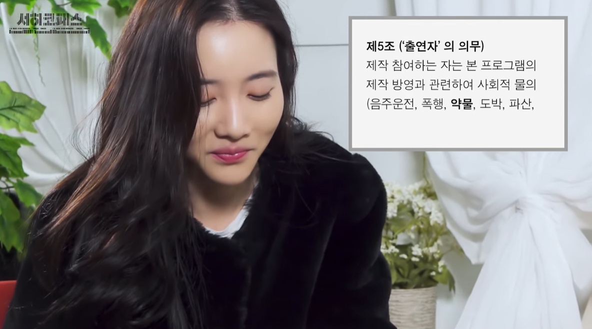 한서희가 "이건 어디 계약서든 저한테 있는 것같다, 이 문항이"라고 하자 "이건 모든 연예인에게 적용되는 거다. 기본 중에 기본"이라는 답변이 돌아왔다. 이에 한서희는 "기본 중에 기본인데 제가 기본을 안 지켜서, 제가 찔려서"라며 웃음을 지었다.