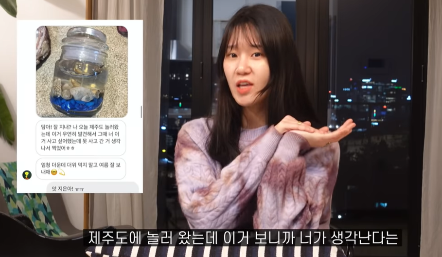 그는 "내가 민박에 있을 때 제주향을 담은 제주캔들을 사고싶다고 말한 적이 있었는데, 셋이 같이 사러가기로 했다가 바빠서 못 샀었다. 서울 와서 며칠 뒤에 지은이한테 메시지가 왔더라. 제주캔들 보니까 네 생각이 나더라 면서. 지은이 정말 착하구나 생각했다"라며 미소지었다.