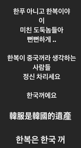 송가인도 16일 자신의 인스타그램에 "김치도 한복도 우리나라 대.한.민.국 거예요! 제발^^ #김치 사랑 #한복 사랑"이라는 직언과 함께 한복을 입은 사진도 게재했다.