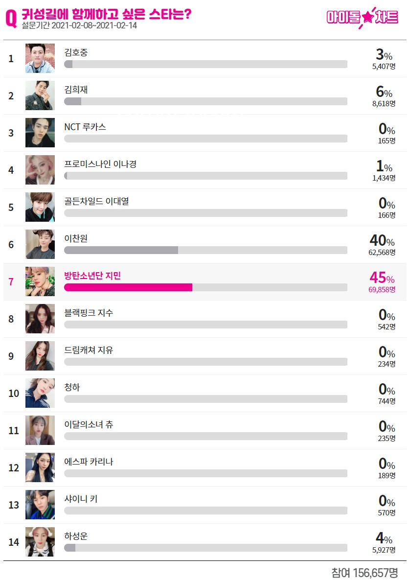 지민은 아이돌차트에서 지난 8일부터 14일까지 진행한 '귀성길에 함께하고 싶은 스타는?' 설문에서 총 투표수 15만 6657표 중 6만 9858표(투표율 약 45%)로 1위에 올랐다.