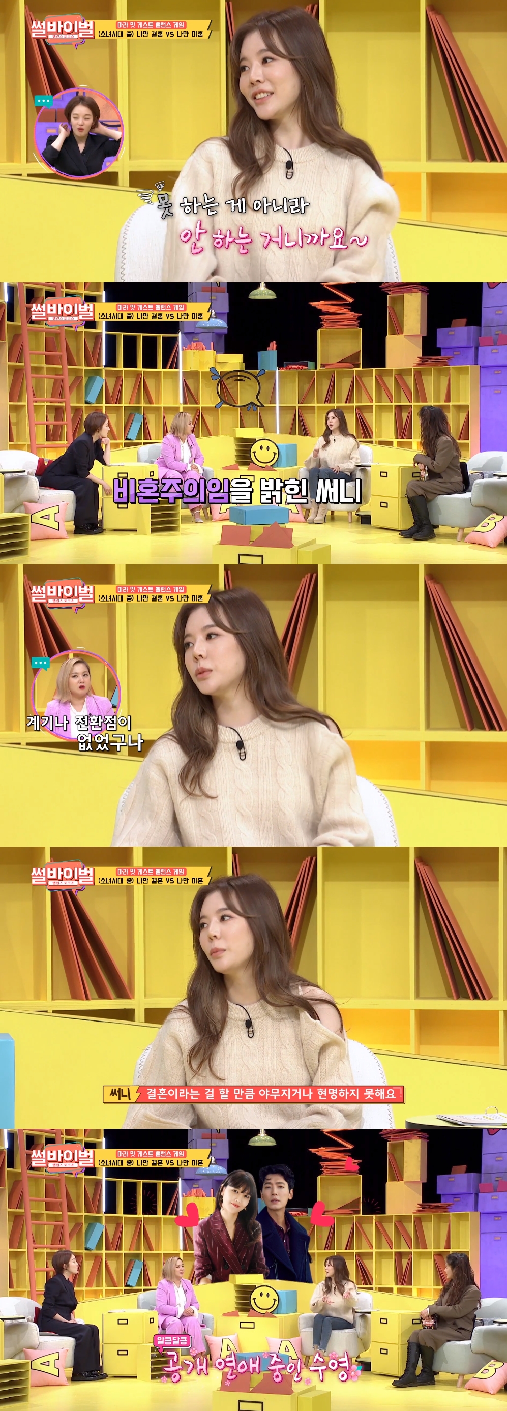 써니는 "못하는 게 아니라 안 하는 거니까"라고 여유를 보이며 비혼주의를 하겠다는 마음도 변함이 없다고 했다. "아직 그 생각을 뒤집을 만한 전환점이 없었다. 저는 결혼이라는 걸 할 만큼 야무지거나 현명하지 않다"라고 털어놨다.