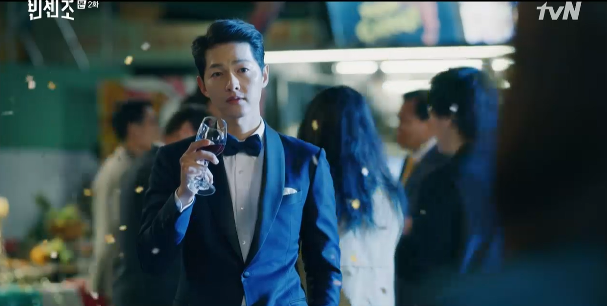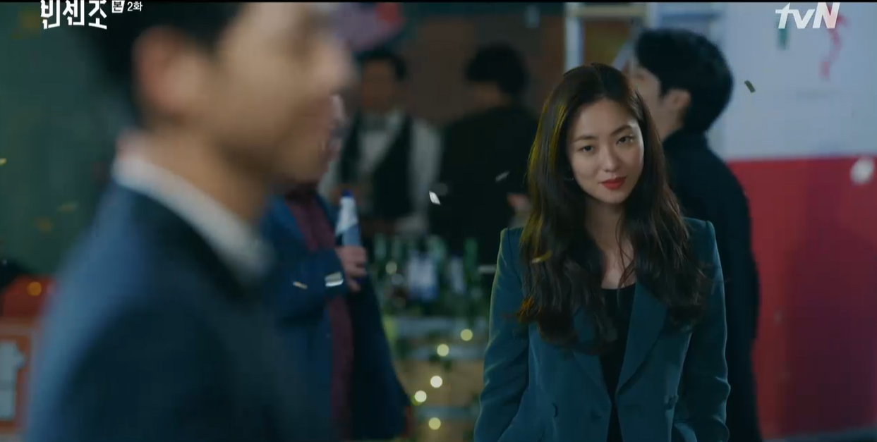 전날 철거공사를 막으려고 고민하던 빈센조는 '인싸들을 위한 오리지널 와인파티'를 제안하는 SNS를 올렸고, 이 게시물이 무한공유되며 성대한 파티가 열렸던 것. 빈센조의 영리한 계획에 '좋아요'를 누른 차영은 미소를 지으며 그를 바라봐 전개에 흥미를 더했다.