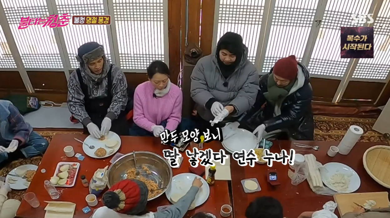 23일 방송된 SBS'불타는 청춘'에서 청춘들이 모두 힘을 모아 떡만둣국을 준비했다. 막내 오브 막내 이기찬이 누님들의 사랑을 한몸에 받은 가운데 형님들은 만두를 빚으며 티격태격했다.