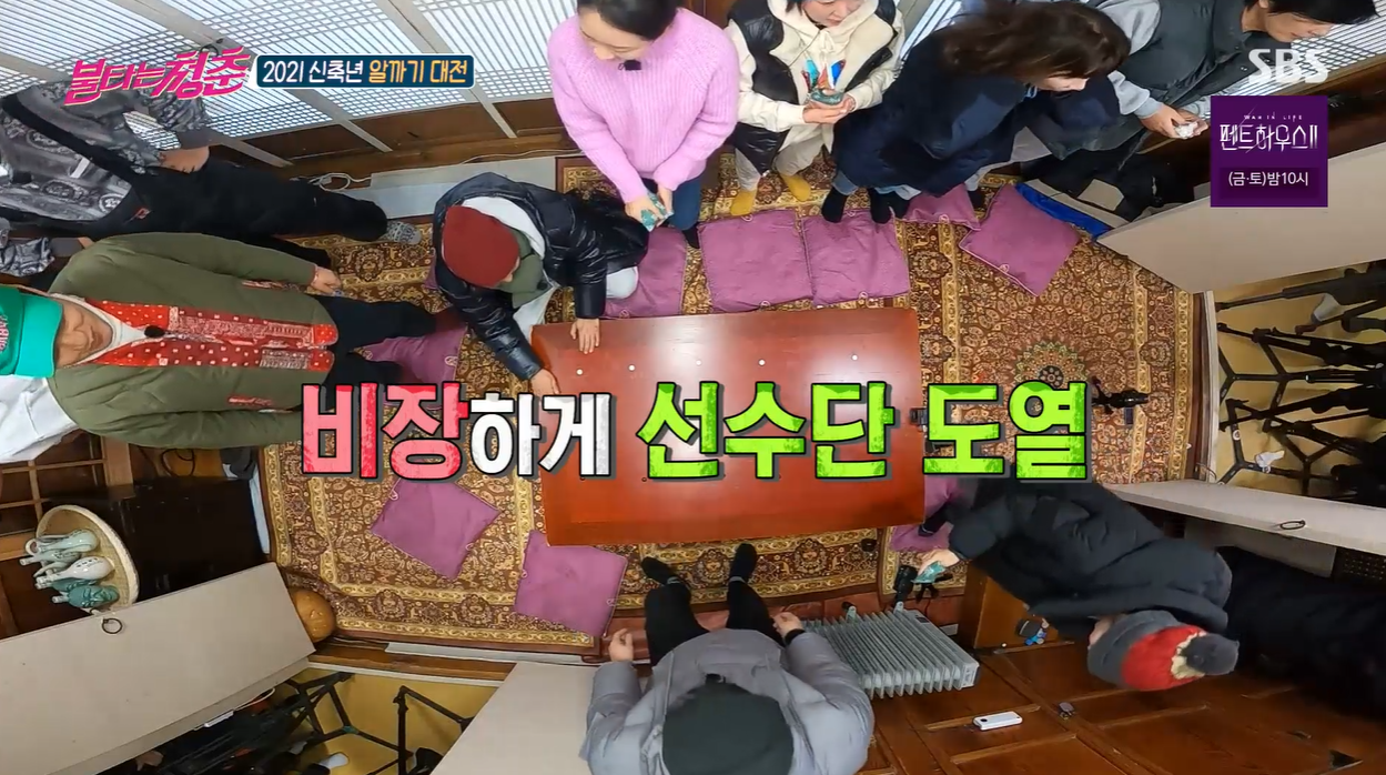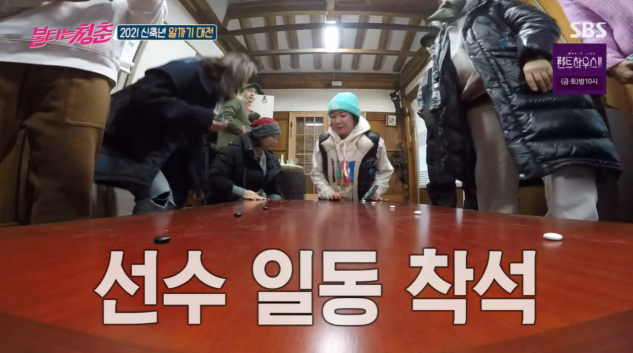 추운 날씨에 야외활동을 이어간 청춘들은 이어 실내 경기에 돌입했다. 최성국은 1980년대 마요네즈 CF로 인기를 모았던 1대 모델 이연수와 2대 모델 이상아로 팀을 나눠 '알까기' 팀대결을 펼치자고 제안했다. 마요네즈퀸들이 직접 팀을 구성한 가운데 이연수는 이기찬, 최민용, 김혜림을, 이상아는 구본승, 김부용, 조하나을 호명했다.