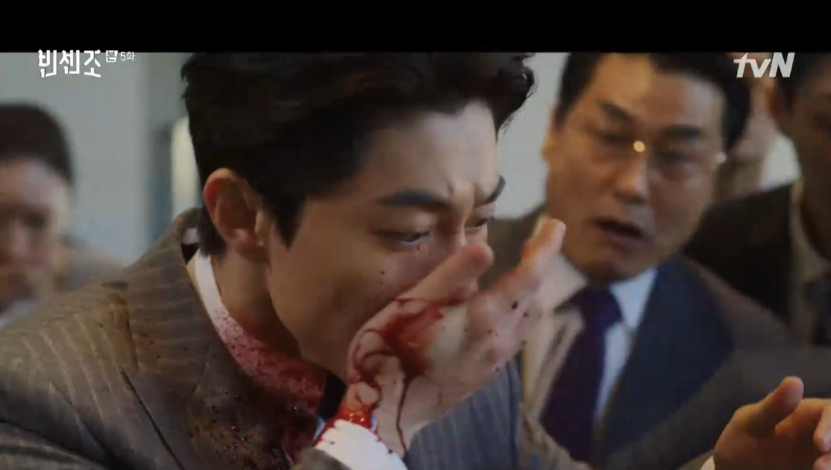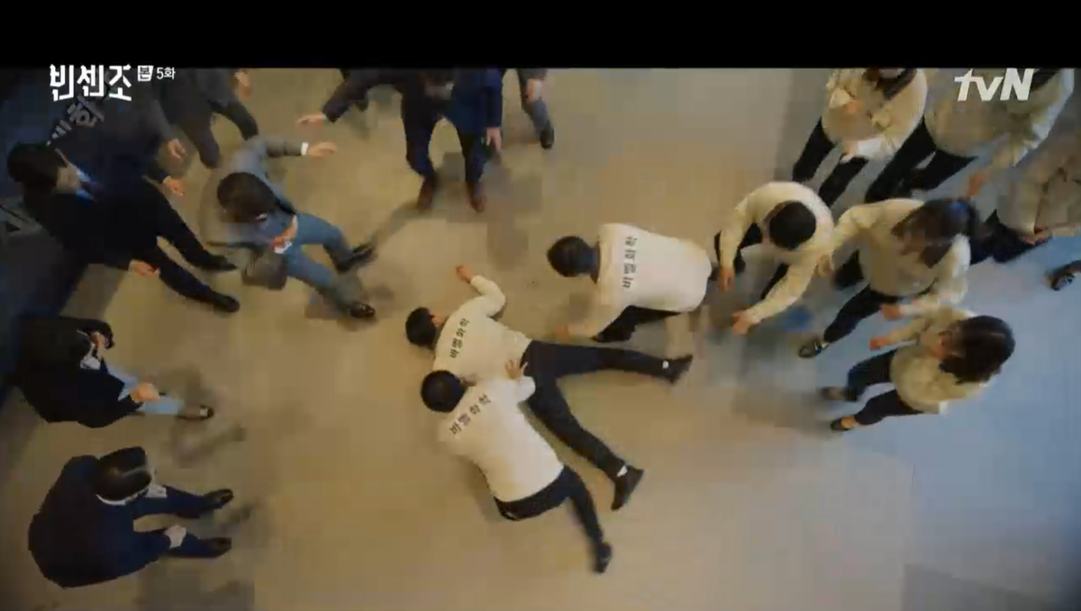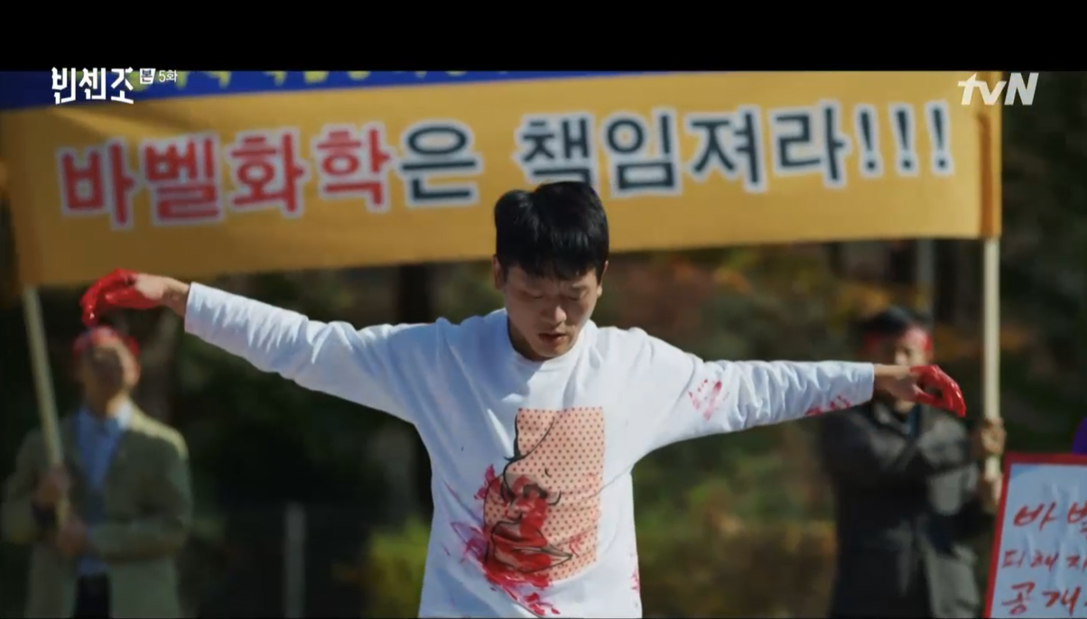 하지만 바벨화학과 합의를 하기로 한 피해자 유족들은 좀처럼 차영을 신뢰하지 않았다. 이에 빈센조는 시위에 사용하던 확성기를 치켜들고는 "당신같은 분들 때문에 바벨그룹이 잘 되는 거다"라고 경고했다.
