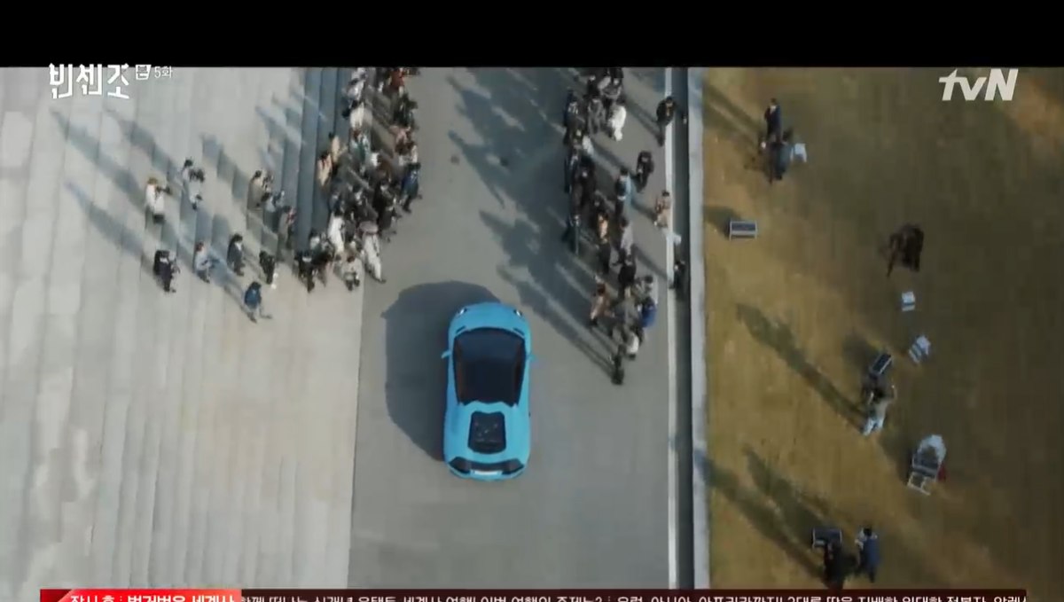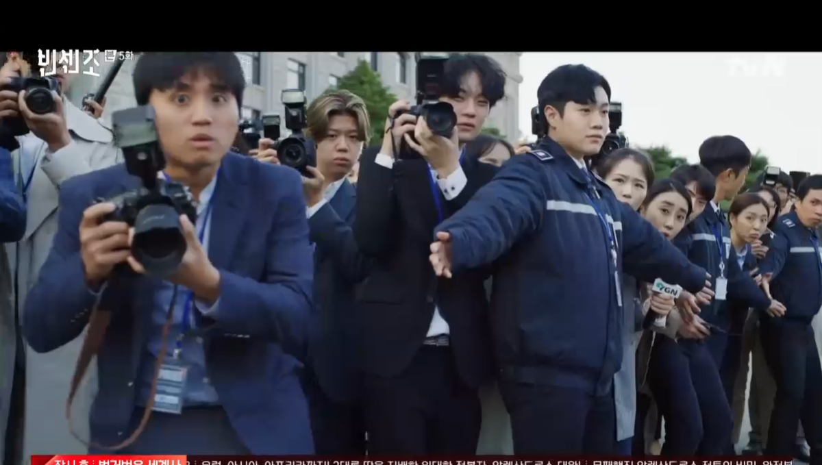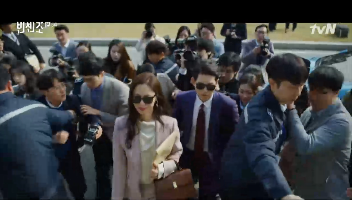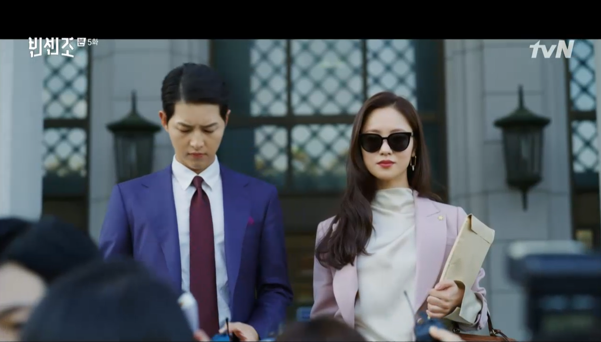 선글래스를 착용한채 내린 사람은 빈센조와 홍차영, 두 사람은 화보라도 찍을 듯이 내려 단숨에 주목을 끈다. 쏟아지는 기자들의 질문에 빈센조는 이탈리아어로 "악은 악으로 처단한다"고 말한다.