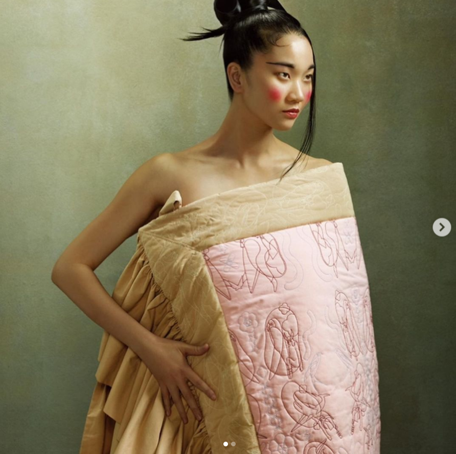 사진 속에서 장윤주는 도장을 찍은 듯 새빨간 볼터치에 상투를 틀다만 듯한 머리, 이불을 둘둘 만듯한 드레스를 입은 채 강렬한 카리스마를 뿜어내고 있다.