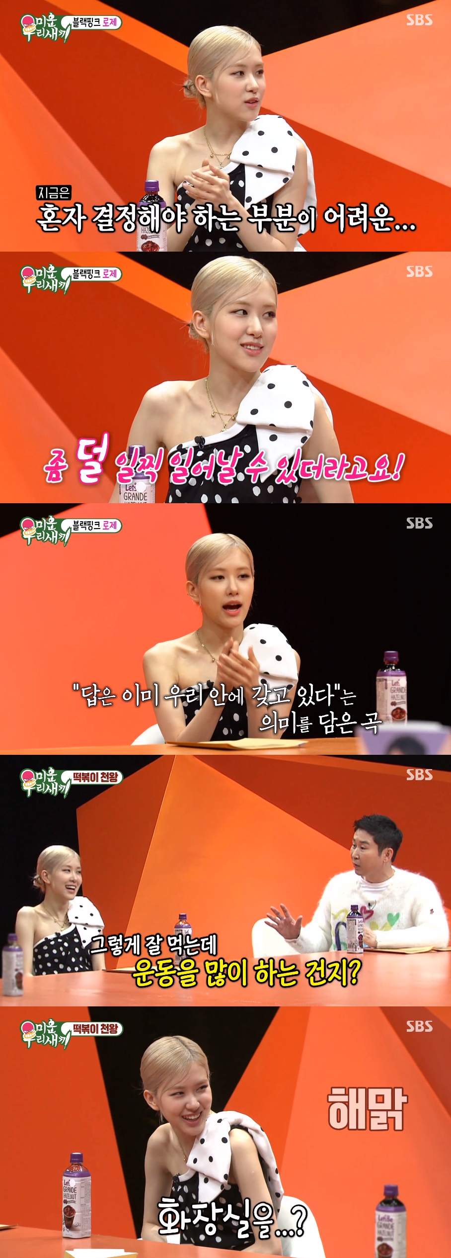 MC서장훈과 신동엽은 그런 로제에게 살이 찌지 않는 이유를 물었고, 로제는 "소화가 잘 되나? 화장실을 자주 가나?"라고 갸우뚱해 웃음을 안겼다.