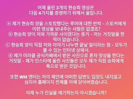 부연 설명도 더했다. 자신이 영상을 올린 이유는 다음 네 가지를 증명하기 위한 것이었다면서 "승희 양을 스토킹했다는 루머에 대한 반박, 승희 양이 저와 가까운 사이였다는 증거, 승희 양이 저와 이야기 나누면 끝날 일이라는 점, 제가 미라클 공식 카페에서 받은 사진으로 혼자 망상을 한다는 거짓말"이라고 설명했다.