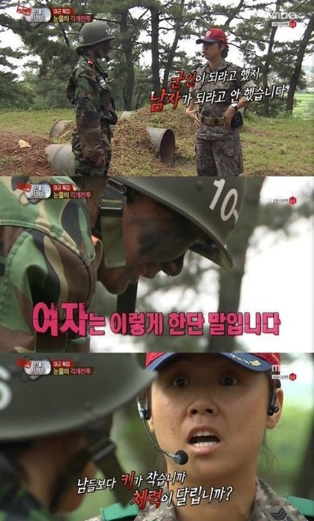 하지만 팔굽혀펴기를 하던 맹승지는 "못하겠습니다. 무릎 꿇고 하겠습니다. 여자는 이렇게 한다"고 말했다. 이 모습을 본 소대장은 "군인은 그렇게 안한다. 군인이 되라고 했지 남자가 되라고 한 적 없다"고 말했다. 또한 소대장은 "남들보다 키가 작습니까. 체력이 달립니까"라며 "체력이 부족하면 훈련이라도 열심히 하든지, 정신이라도 차리고 똑바로 합니다. 어디서 눈물을 보입니까"라며 호통쳤다.