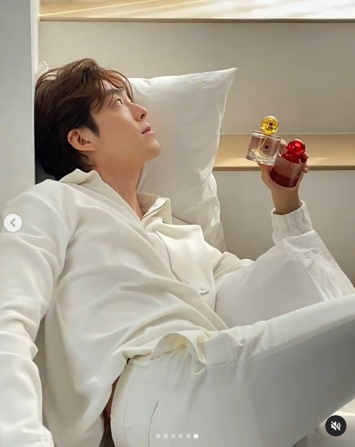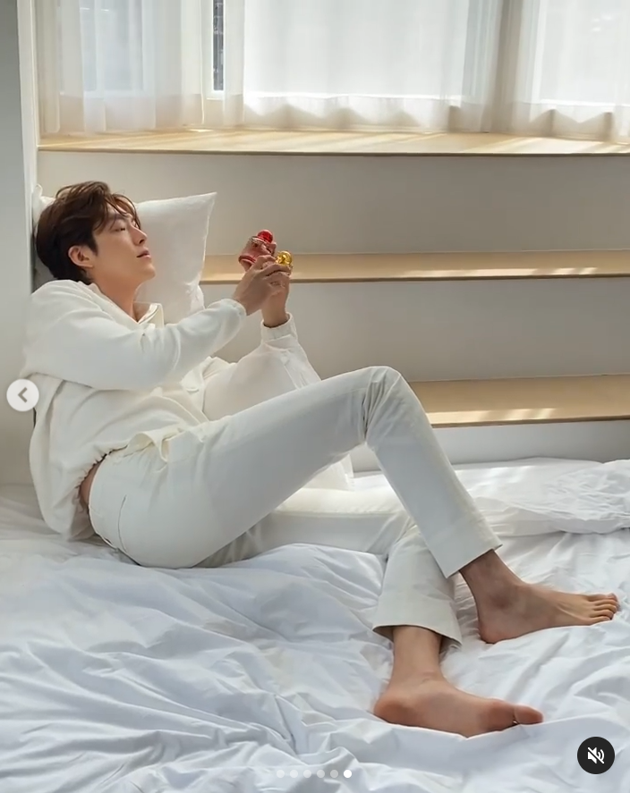 김우빈은 31일 자신의 SNS에 자신이 모델로 활동 중인 향수 촬영 현장 모습을 공개했다. 사진 속에서 김우빈은 흰색 셔츠에 흰색 바지를 입고 맨발로 햇살이 칸칸이 드는 계단 참에 기대어 앉아있다.