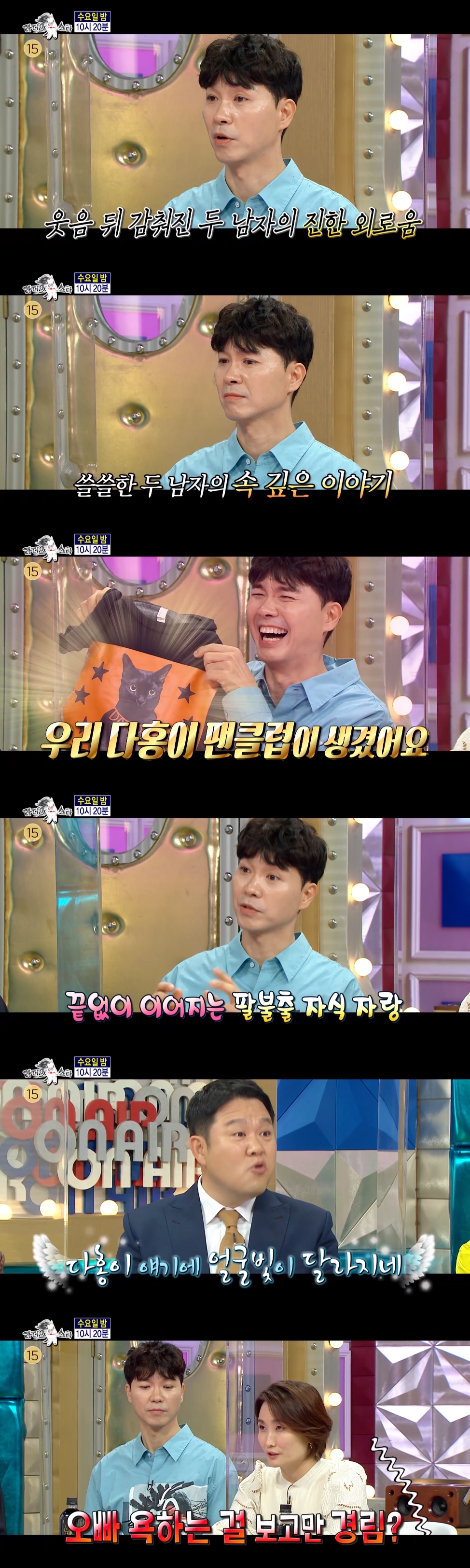 반려묘 다홍이를 얘기할 땐 눈이 반짝이기도 했다. 박수홍은 "우리 다홍이 팬클럽이 생겼다", "얘는 더 특별하다. 내 발을 핥아준다. 이 나이에 누가 내 발을 핥아주겠나"라며 애정을 가득 보였다. 이에 MC 김구라는 "다홍이 얘기할 때 얼굴이 핀다"라고 반응했다.