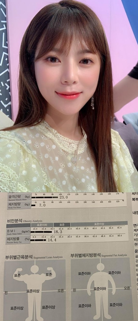 이 사진은 양지은의 인바디 결과 측정표다. 양지은은 체지방률이 14.4로 표준 이하를 기록했고 BMI도 18.3로 표준 이하를 나타냈다. 골격근량 23kg, 체지방량 7kg도 눈에 띈다.
