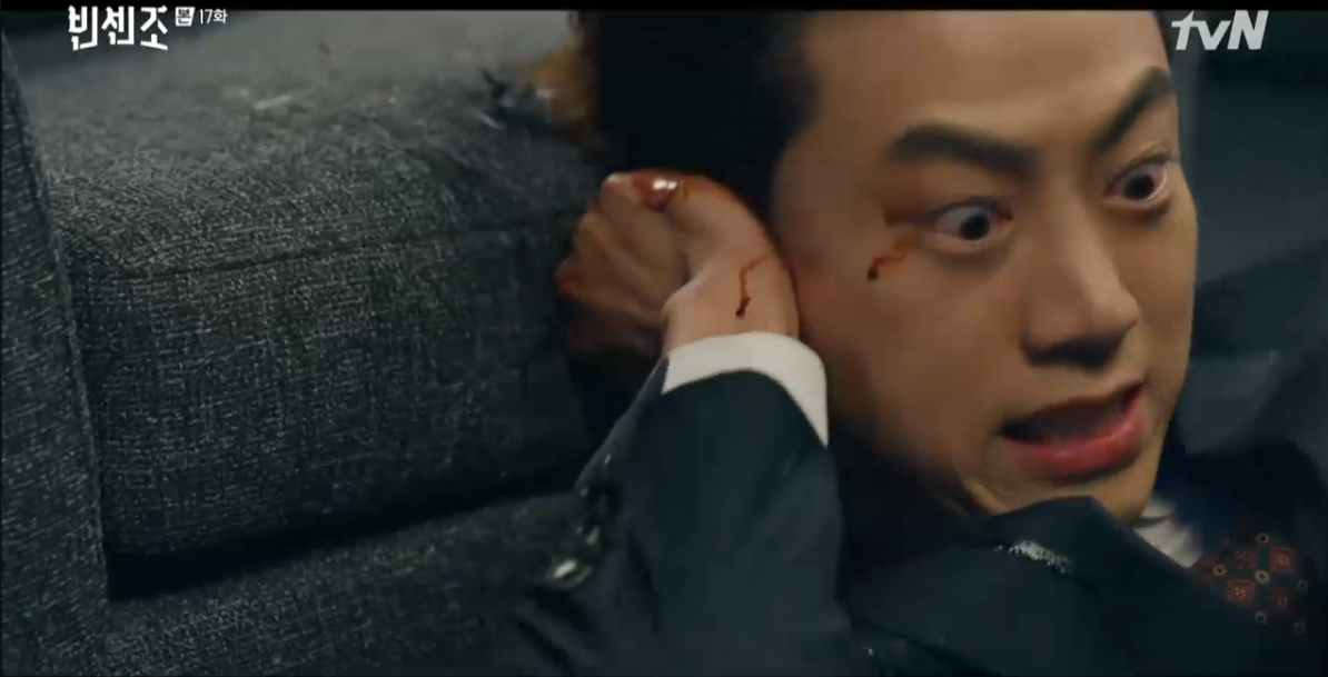 피투성이가 된 얼굴로 뒤돌아 나가던 빈센조는 "아, 그래도 애피타이저는 있어야지"라며 장한석에게 다가서 귀를 쐈다. 장한석이 비명을 지른 가운데, 빈센조는 멀어져갔다.