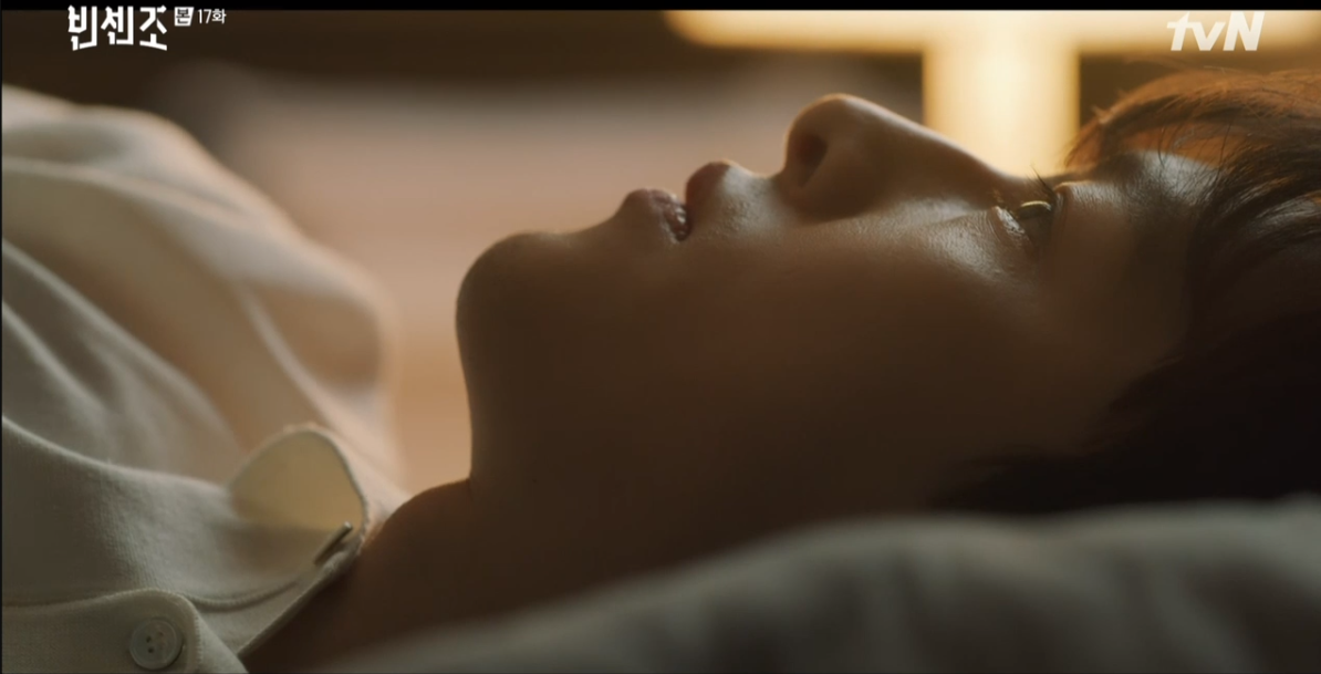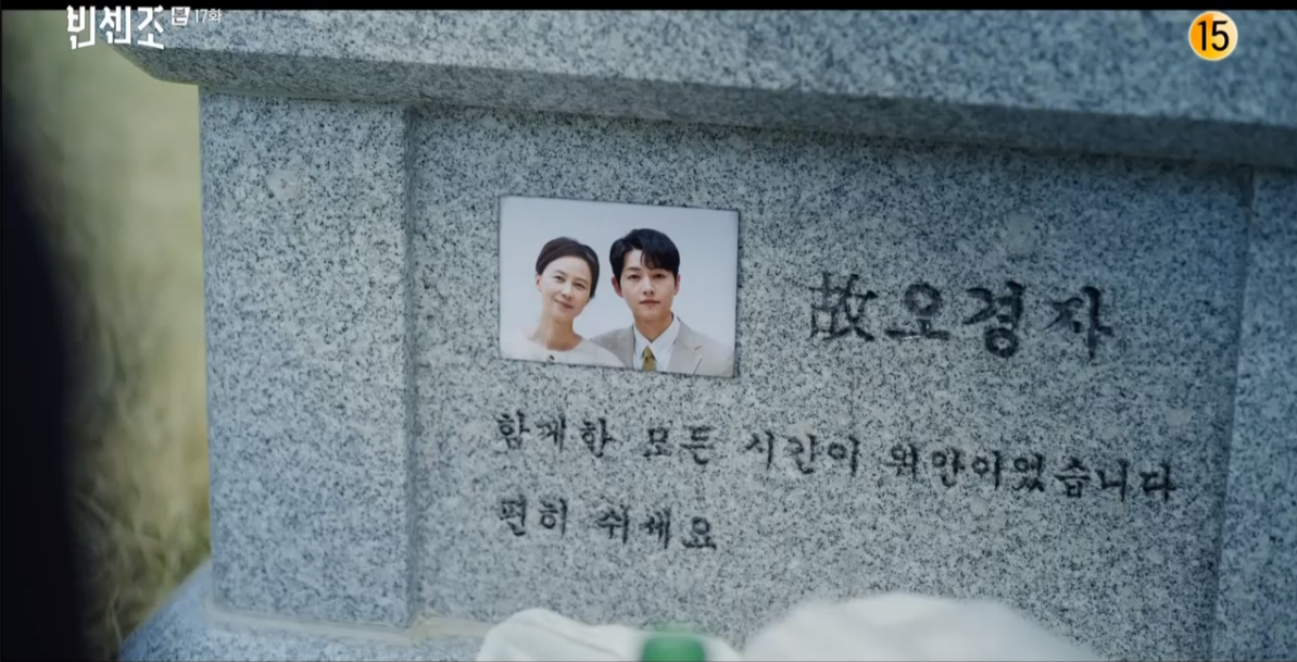 빈센조는 병원으로 와 고요한 시신이 되어 누워있는 어머니 오경자(윤복인 분)을 바라보며 처음으로 "엄마"라고 부르며 눈물을 흘렸다. 어린 자신을 고아원에 보냈던 엄마를 원망했던 빈센조는 이미 어머니를 용서했지만 그 마음을 표현하지 못했다.