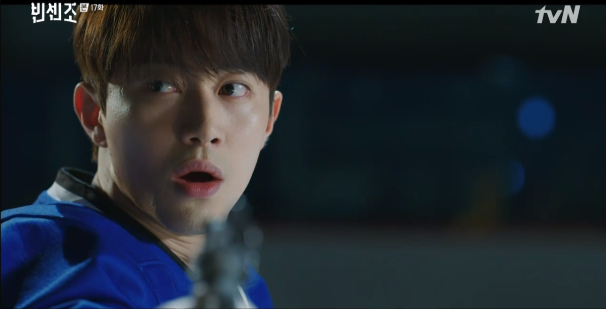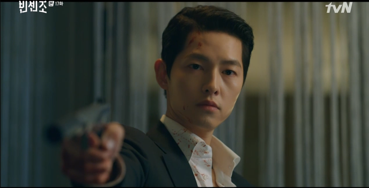 하지만 장한서 보다 빨리 총구를 겨눈 쪽은 빈센조였다. "그 형에 그 동생이네. 애초에 기대도 안했지만"이라며 빈센조가 총을 겨눈 가운데, 인터폴이 빈센조를 둘러쌌고, 그때 장한서의 총구가 빈센조의 왼쪽 가슴을 쏴 빈센조가 쓰러졌다.