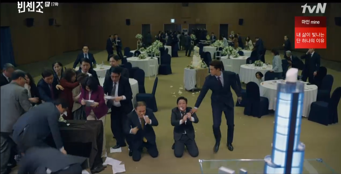 하지만 현장은 이미 금가프라자의 까사노 패밀리가 접수한 상태였다. 현장에는 최명희의 지시를 받고 홍유찬(유재명 분) 변호사 사망사건에 관여했다가 빈센조의 심복이 된 킬러가 등장했다. 그는 폭탄을 배에 메고 등장해 자기의 뜻대로 하지 않으면 대형케이크로 치장한 폭탄이 터진다고 협박했다.