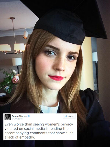 엠마 왓슨은 2일(이하 한국시간) 자신의 트위터에 "소셜미디어를 통해 여성의 개인 사생활을 보는 것보다 더 나쁜 것은 이 사건에 대한 감정이입이 부족한 코멘트를 읽는 것이다"는 글을 게재했다. 이 글은 최근 논란이 된 할리우드 여자 스타들의 사생활 사진 유출과 이를 접한 사람들의 반응을 겨냥한 것으로 보인다.