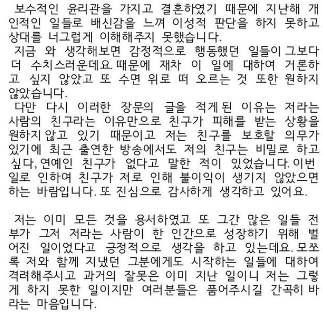또 "이번 일로 친구가 저로 인해 불이익이 생기지 않았으면 하는 바람이다. 저는 이미 모든 것을 용서 하였고 또 그간 많은 일들 그저 저라는 사람이 한 인간으로 성장하기 위해 벌어진 일이었다고 긍정적으로 생각을 하고 있다"며 "저와 함께 지냈던 그분에게도 시작하는 일들에 대하여 격려해 주시고 과거의 잘못은 이미 지난 일이니 저는 그렇게 하지 못한 일이지만 여러분들은 품어주시길 바란다"고 적었다.
