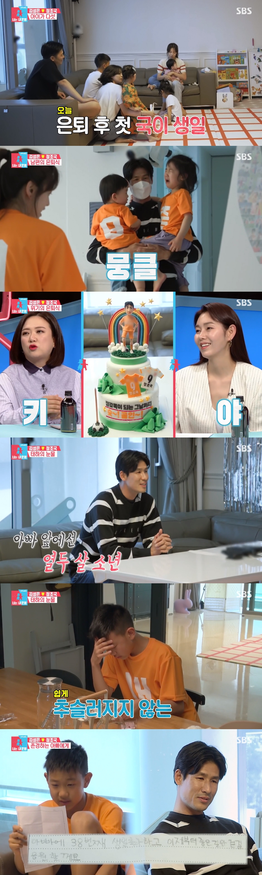 특히 큰아들 태하는 손편지를 준비해 이목을 끌었다. 하지만 편지를 읽기도 전에 울컥해 읽기를 마다했다. 결국 의자에 앉아 눈물을 쏟았지만, 마음을 추스른 후 편지를 읽기 시작했다. 태하는 "이제부터 좋은 길만 걷길 기도할게요. 아빠 은퇴 축하해요"라며 울먹이는 목소리로 진심을 전했고, 정조국은 그후 태하를 안아줬다.