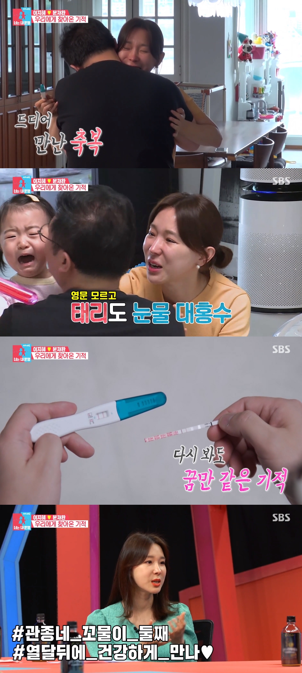 지난 17일 방송된 SBS 예능 프로그램 '동상이동 시즌2-너는 내 운명'에서는 이지혜, 문재완 부부에게 둘째가 찾아온 사실이 공개됐다. 세번째 시험관 시술 끝, 둘째 임신에 성공한 것. 이지혜는 임신 테스트 결과를 본 후 문재완에게 안겨 눈물을 쏟았다.