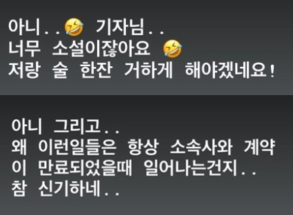 21일 한예슬은 자신의 인스타그램 스토리에 "아니 기자님. 너무 소설이잖아요. 저랑 술 거하게 해야겠네요! 아니 그리고 왜 이런 일들은 항상 소속사와 계약이 만료됐을 때 일어나는 건지. 참 신기하네"라는 글과 함께 유튜브 채널 '가로세로연구소'(이하 '가세연') 방송 화면 캡처본을 올렸다.