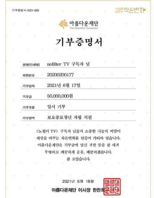 이와 함께 아름다운재단에 기부한 기부증명서도 공개했다. 이 증명서에 따르면 김나영은 자신의 유튜브 채널 '노필터 TV' 구독자명으로 지난 17일 5000만 원을 기부한 것으로, 해당 금액은 보호종료청년 자립 지원에 쓰일 예정이다.