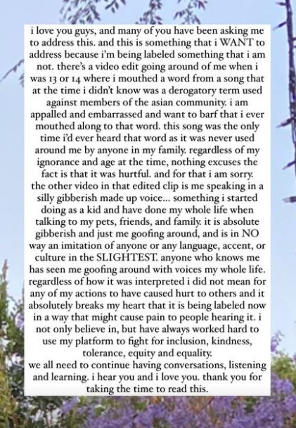 그는 "내가 13살~14살 즈음 찍힌 동영상이 있는데, 여기에서 아시아 사람들에게 모욕적인 뜻의 단어를 사용했다는 걸 몰랐다. 나 자신이 창피하고 그 단어를 다시 뱉어내고 싶다"라고 말했다.