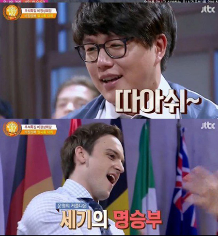 평소 성시경앓이를 하던 기욤 패트리는 성시경에게 "죄송하다. 봐주지 않겠다"고 선전포고했고, 성시경은 "이게 뭐라고 잡으면 용을 쓰게 돼 있다"며 불꽃 튀는 대결을 암시했다. 전현무가 시작을 알리자 대접전이 펼쳐졌고, 성시경이 기욤 패트리의 손목을 꺾으며 승리했다. 이에 유세윤은 카메라를 향해 "디스 이즈 코리아"라고 외치며 기뻐했고, 전현무는 "성머슴!"이라고 말해 웃음을 자아냈다.