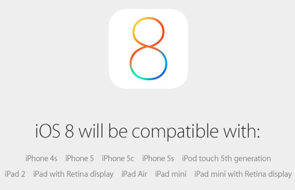 한편, ios8로 구동 가능한 모델은 아이폰4s부터 아이폰5, 아이폰5c, 아이폰5s, 아이팟 터치 5세대, 아이패드2, 아이패드 레티나 디스플레이, 아이패드 에어, 아이패드 미니 등이 있다.