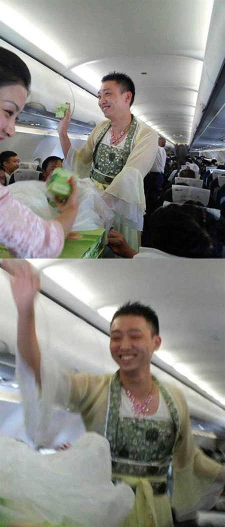 보도에 따르면 중국 춘추항공사는 추석을 맞이하여 독특한 승객 서비스를 선보였다. 이 서비스는 바로 남승무원이 여신 분장을 하고 기내 서비스를 진행한 것. 이 남승무원은 여신 분장을 한 채 시종일관 유쾌한 미소로 음료수를 나눠주었다. 승객들의 반응은 매우 뜨거웠고 이 항공사는 이벤트를 성황리에 마쳤다.