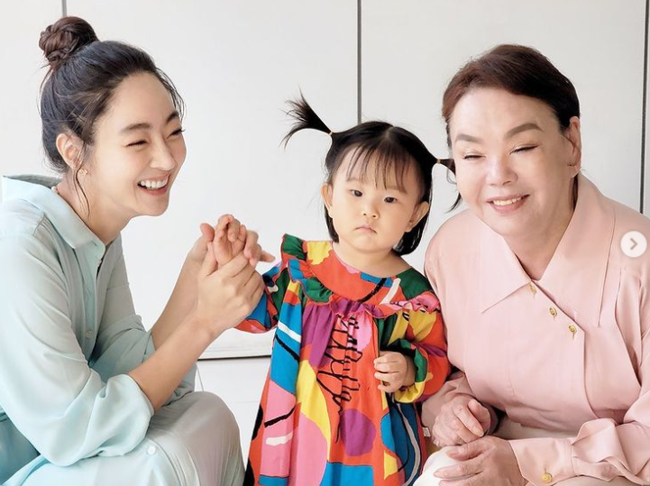 은은한 파스텔톤 원피스로 시밀러룩을 선보인 고부와 컬러풀은 원피스에 양갈래 머리를 묶은 손녀까지 화기애애한 3대의 모습이 저절로 미소를 자아냈다.