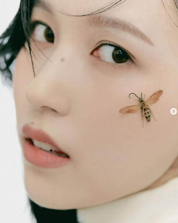 왼뺨 위로 살포시 내려앉은 말벌이 타투인듯 눈길을 사로잡는다. 28일 트와이스 공식SNS 계정을 통해 공개된 이번 화보는 얼루어코리아와 함께 진행됐다.