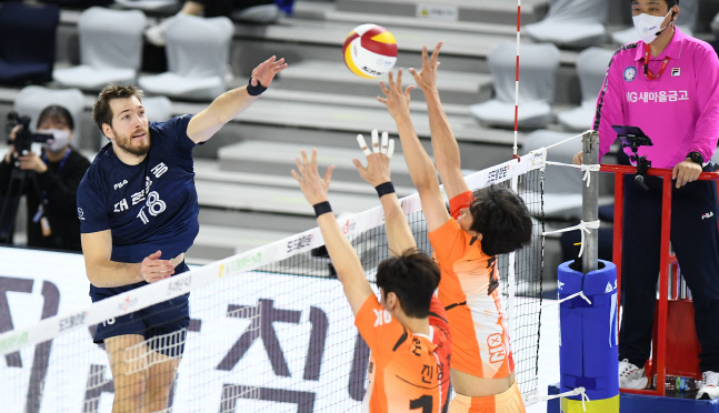 대한항공은 외국인 공격수 링컨이 19득점, 공격성공률 66.66%로 팀을 지휘했다. 임동혁도 공격성공률 73.68%를 바탕으로 16득점을 기록하며 뒷받침했다. 3세트 22-21로 근소하게 앞선 상황에서도 둘의 가치가 빛났다. 임동혁이 상대 추격 의지를 꺾는 후위 공격으로 점수를 보탰고, 23-22에서는 링컨이 시간차 공격으로 세트포인트를 따냈다.