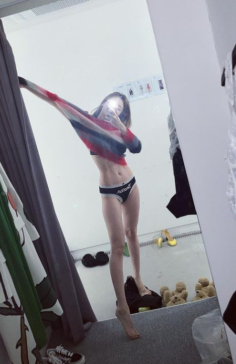 또 다른 사진에서는 촬영용 옷을 입다말고 거울 속 자신을 포착했다. 촬영용 신발과 의상이 즐비한 대기실의 모습이었다.
