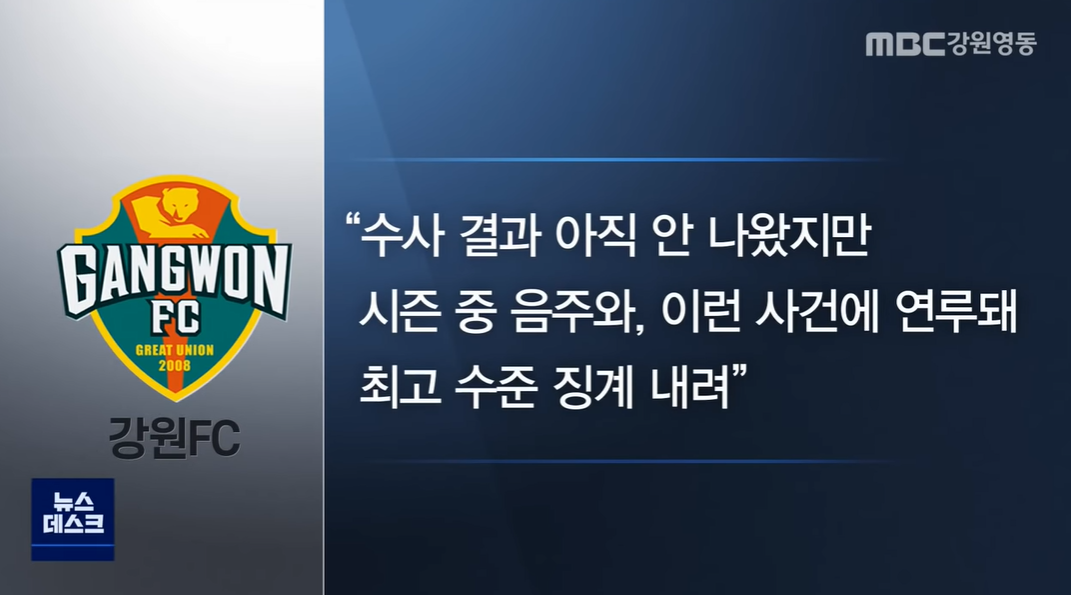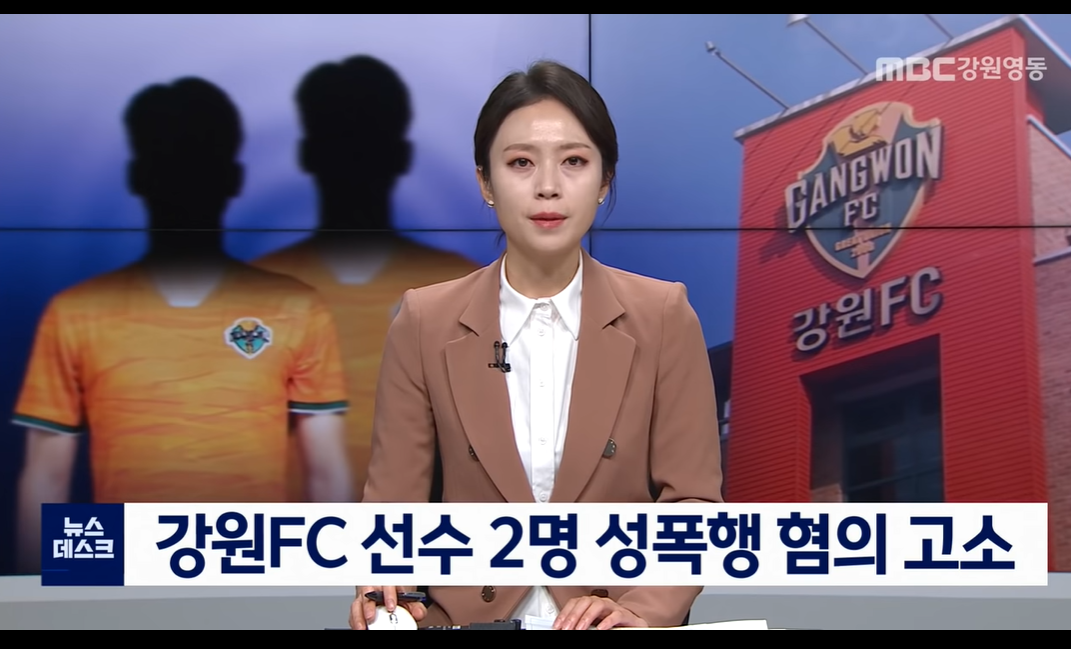 MBC뉴스 강원은 4일 "성폭행으로 피소된 강원FC 소속 선수 2명은 경찰조사를 받고 있으며, 강원FC는 이들을 무기한 출전 정지시켰다"고 보도했다.