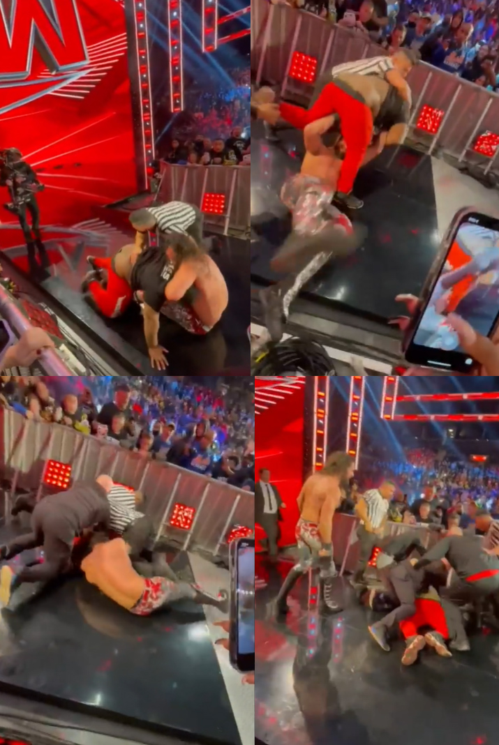 촬영팀 안쪽에서 순식간에 튀어나온 팬에게 옆구리를 들이받힌 롤린스는 무차별 공격에 깔려 허둥댔고, 나중엔 머리채를 잡혀 목을 빼내지 못했다. 결국 심판이 팬을 제지하고 보안요원 등 3명이 달라붙어서야 간신히 롤린스를 구조(?)했다.