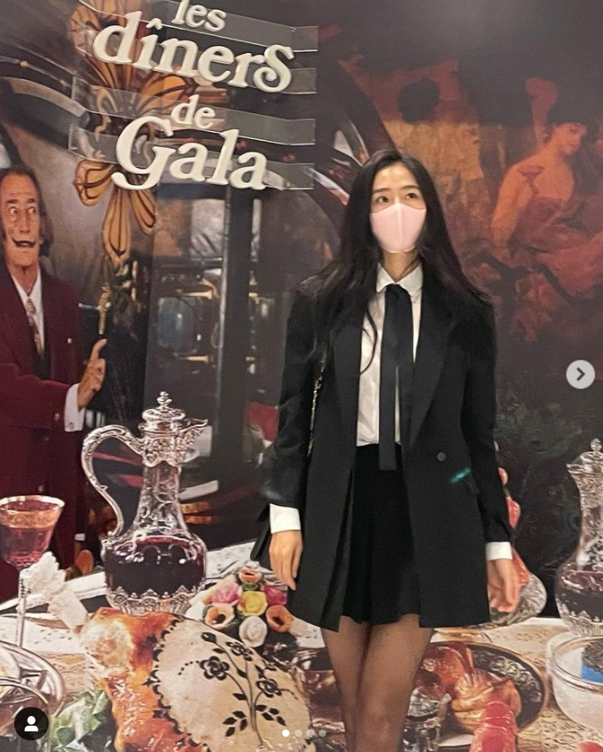 사진 속에서 홍수현은 언뜻 교복으로 보이는 검정 재킷과 짧은 주름치마, 길게 늘어뜨린 검정 타이 차림으로 전시장을 찾았다. 핑크색 마스크 너머로 오똑한 콧날과 세련된 미모가 눈길을 끌었다.