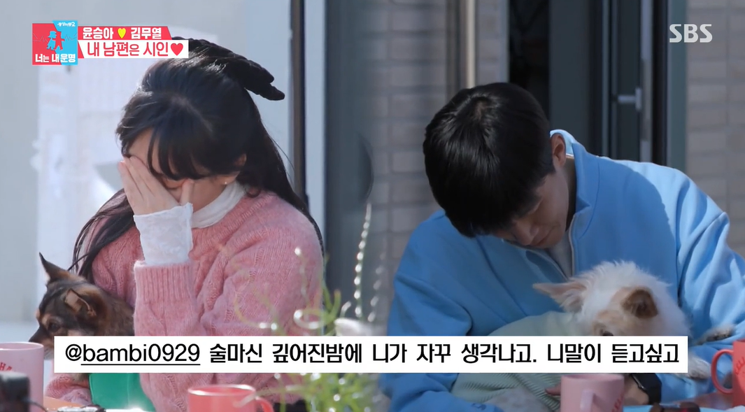 김윤지가 "완전 세익스피어"라며 화제가 된 글을 낭독하자 김무열과 윤승아는 각각 반려견을 안은 채 고개를 들지 못했다.