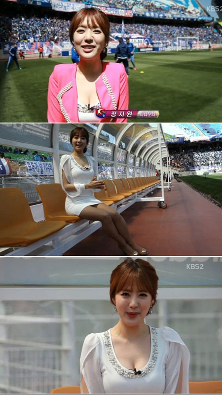 정지원 아나운서는 지난해 3월 수원월드컵경기장을 찾아 뛰어난 몸매를 과시해 화제가 된 바 있다. 당시 정지원 아나운서는 3월 14일 방송된 KBS2TV '비바 K리그'에 출연해 서울역에서 오프닝을 한 뒤 수원월드컵경기장에서 '2013 현대오일뱅크 K리그 클래식' 수원 블루윙즈와 FC 서울의 '슈퍼매치'를 찾았다.