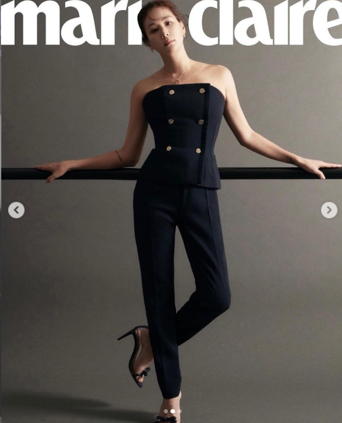 화보 속에서 고소영은 오프숄더 형식의 투버튼 정장 재킷에 매니시한 검정 바지를 매치해 도회적이면서도 세련된 분위기를 연출했다.